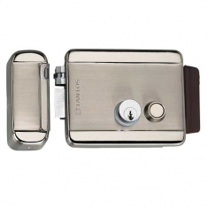 Замок электромеханический, накладной, универсальный, с блокировкой кнопки. Питание 12В/1,5А. Габариты 147*105*37мм. Материал корпуса: сталь c нержавеющим покрытием. В комплекте 5 ключей.